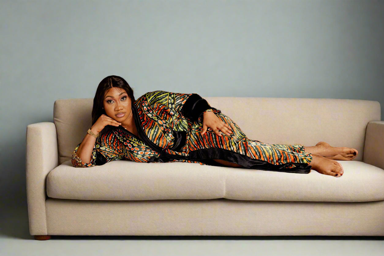Indulge in the richness of African elegance with the Ziora Luxe Robe—a luxurious full-length kimono-style robe made from premium silk Ankara fabric and lined with plush black velvet accents. This bold design features earthy tones of orange, green, and black, with velvet detailing on the collar, sleeves, and waist tie for a polished and regal finish.