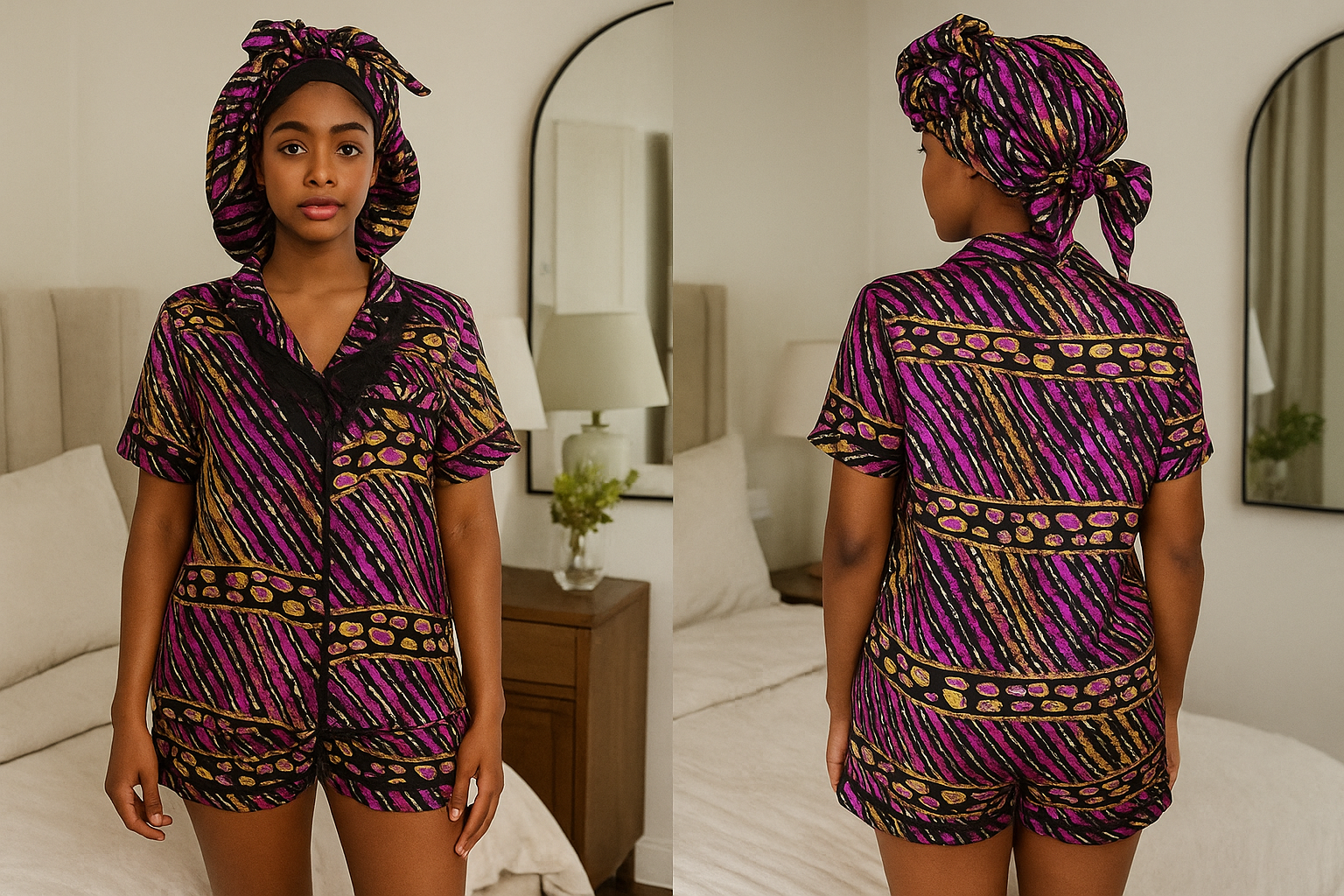 Feel effortlessly feminine in the Ada Luxe Set—a luxurious blend of cultural charm and soft seduction. This two-piece sleepwear is made from silk Ankara fabric featuring rich shades of purple, black, and gold, and is delicately accented with lace detailing on the collar for an added touch of allure.