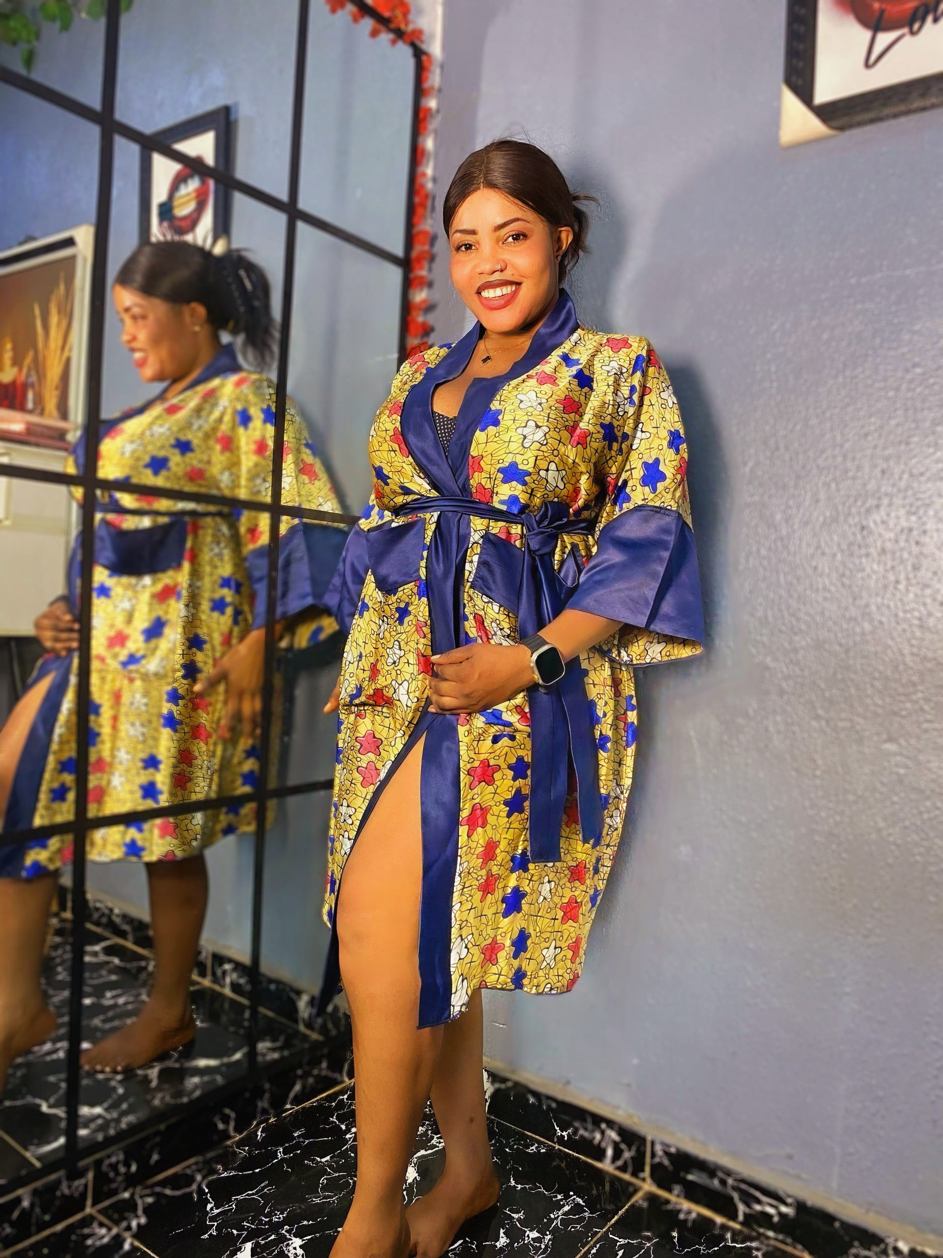Say hello to your new favorite robe: the Nara Robe. This playful, radiant wrap is made from buttery-soft silk Ankara and elevated with rich navy satin accents on the collar, belt, and sleeves. Perfect for warm nights, bridal prep, or lounging in style, this short robe gives you the freedom to feel bold, feminine, and comfortable—all in one look.